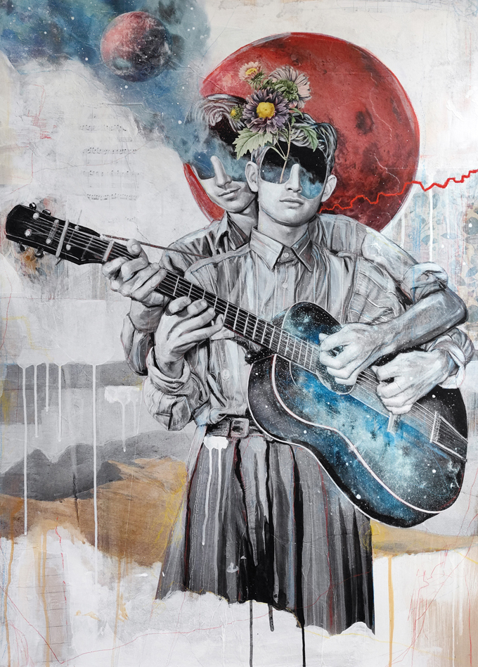 GUITARRA 100×70 xmTécnica mixta sobre tabla. «La guitarra, con sus acordes profundos, marcó el pulso de los corazones cósmicos, dando vida a cada rincón del universo.» Obras